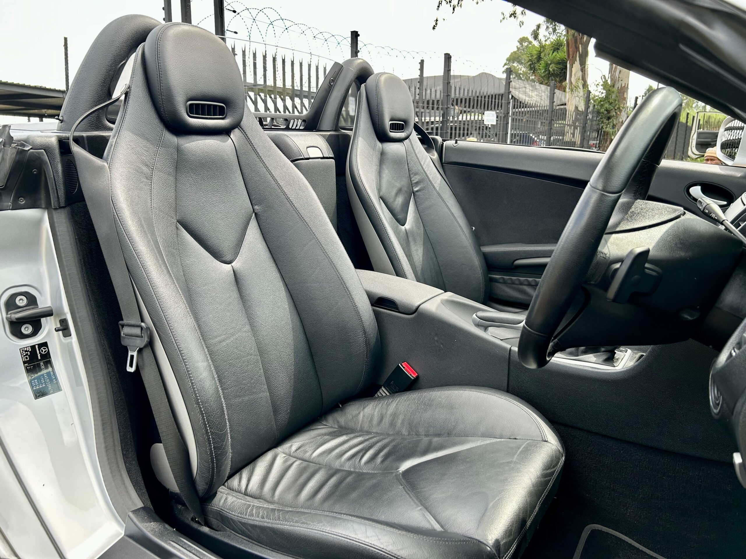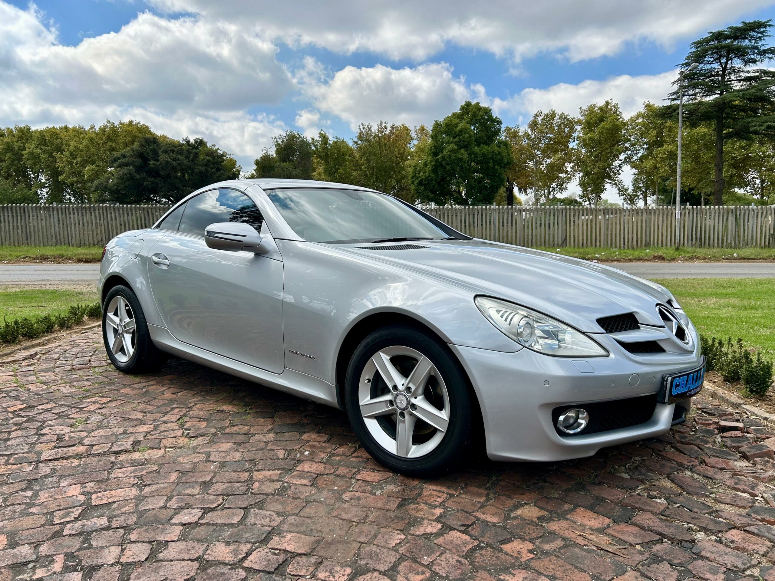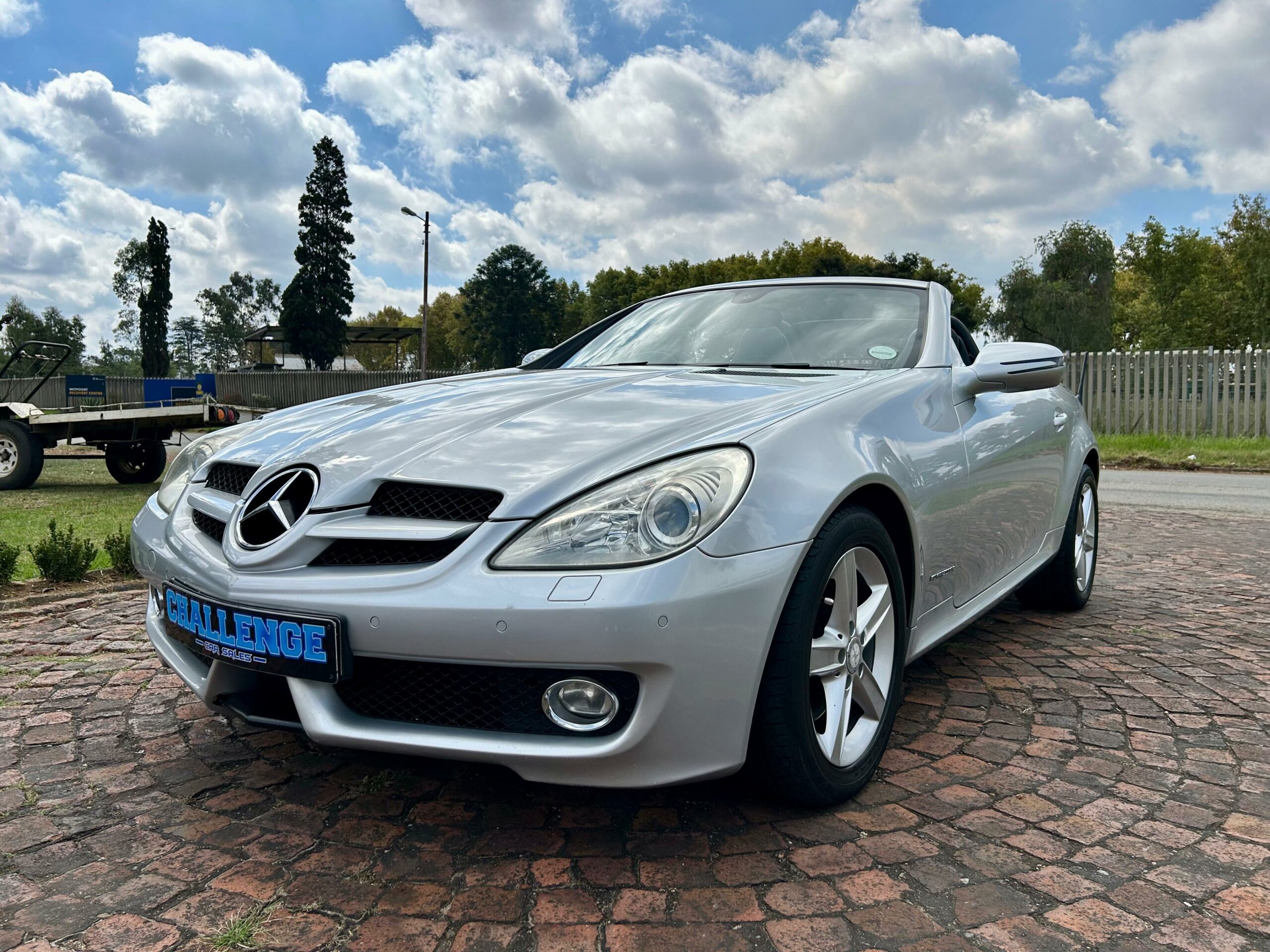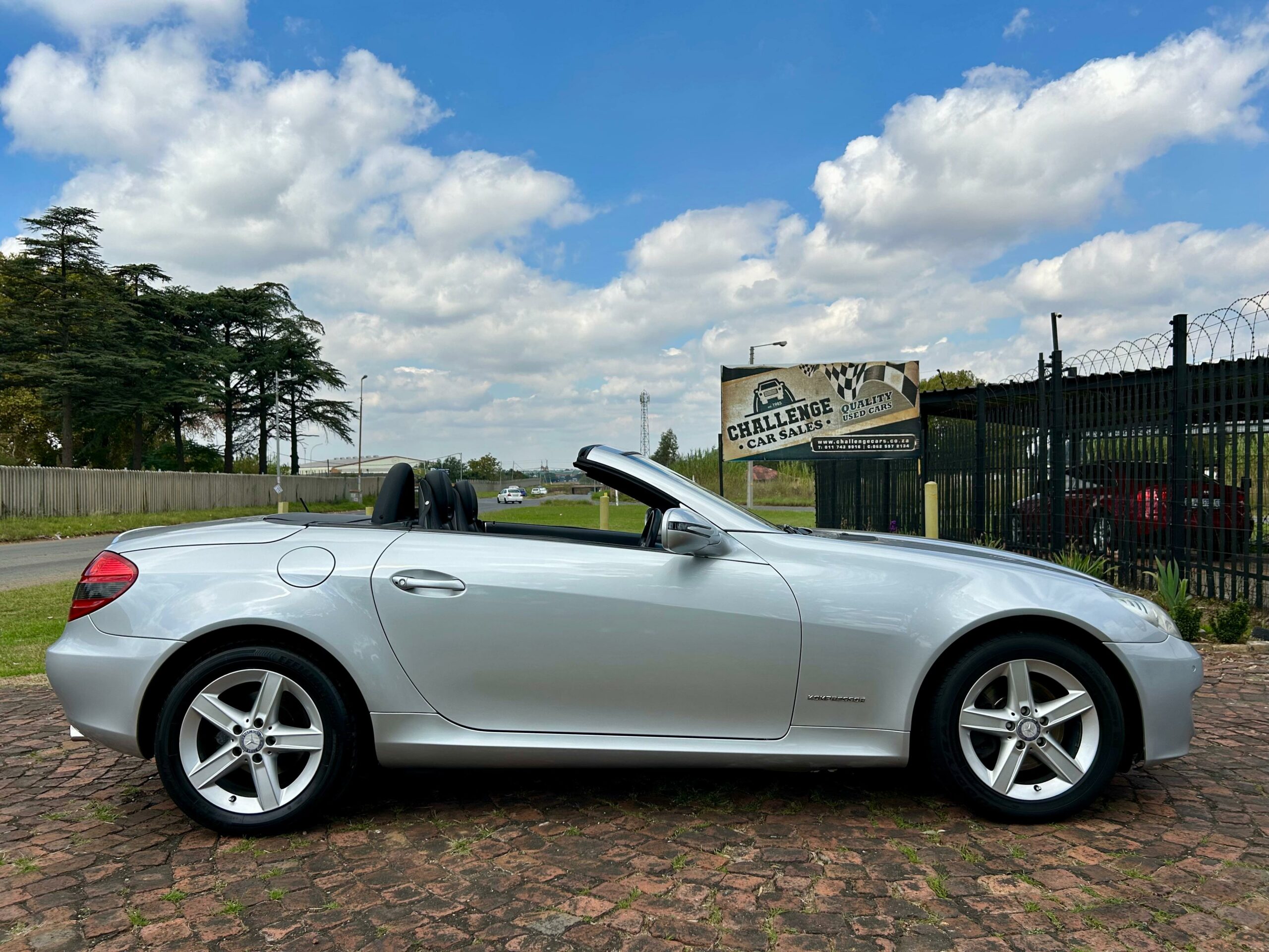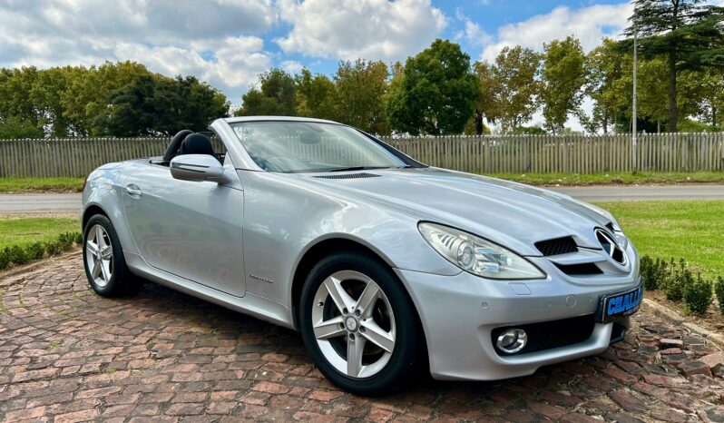 2008 Iridium Silver Mercedes-Benz SLK200 Kompressor. Loaded with ABS, airbags, aircon, electric windows, electric folding mirrors, black leather interior, heated headrests, electric heated seats, automatic xenon lights, fog lights, electric steering wheel adjustment, front and rear parking distance sensors, multi-functional power steering, paddle shift, cruise control, front loader radio with phone connectivity, central locking, service history and spare key.